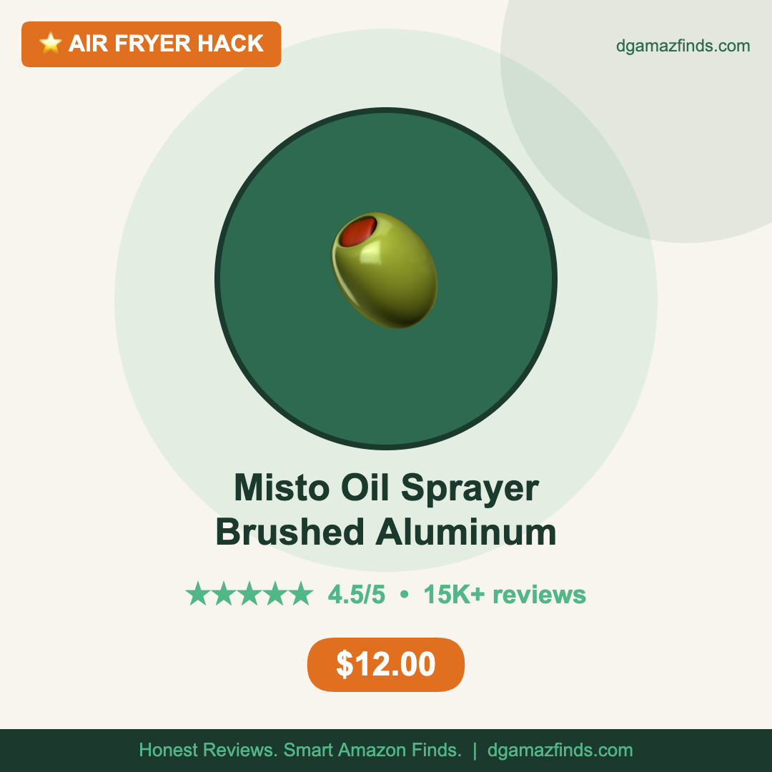 Misto oil sprayer review: refillable, no aerosol chemicals, works with any oil. Perfect for air fryers. Best olive oil sprayer on Amazon under $15.